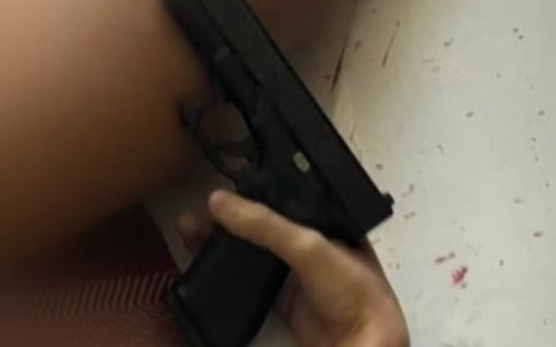 1. Gisele estaria na sala, de costas para a varanda, quando foi abordada por trás: o tenente-coronel teria imobilizado o rosto dela com a mão esquerda e apontado a arma com a direita.