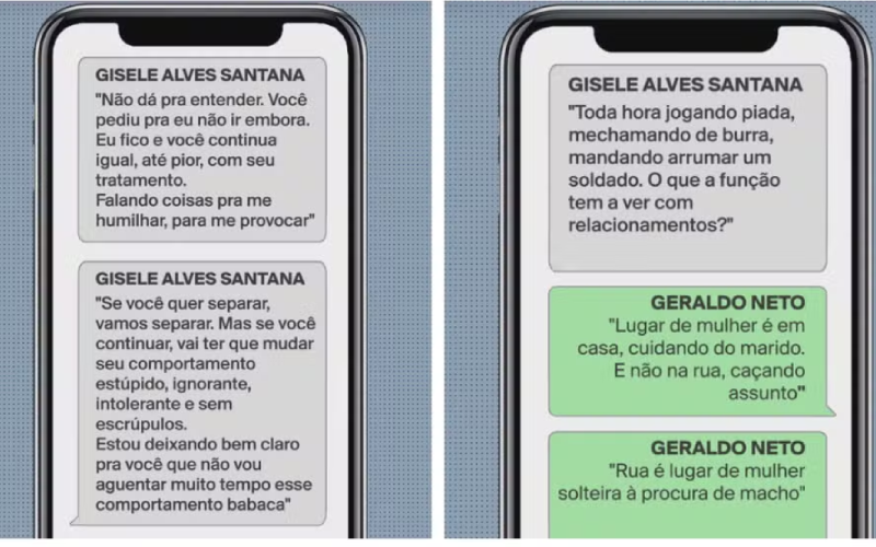 Em outras mensagens, segundo a investigação, Geraldo Neto faz declarações machistas contra a esposa: “Lugar de mulher é em casa, cuidando do marido. E não na rua, caçando assunto. Rua é lugar de mulher solteira à procura de macho”, declarou.