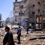 Homem carrega roupas próximo a escombros de prédio após ataque israelense no bairro de Ain Al Mraiseh, em Beirute, no Líbano, em 8 de abril de 2026.