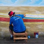 No mural, as cenas nascem aos poucos. “Os pescadores aqui, as barcas pesqueiras… tem mais aqui o pescador”, descreve Rosivaldo Gomes Correa, o Colaça, de Igarapé-Miri, enquanto aponta para a composição ainda em processo. O trabalho segue o ritmo possível diante da chuva do inverno amazônico. “A chuva faz a gente ter que parar, esperar. É o tempo dela e a gente está acostumado a trabalhar assim. A previsão é pra entregar sexta-feira.”