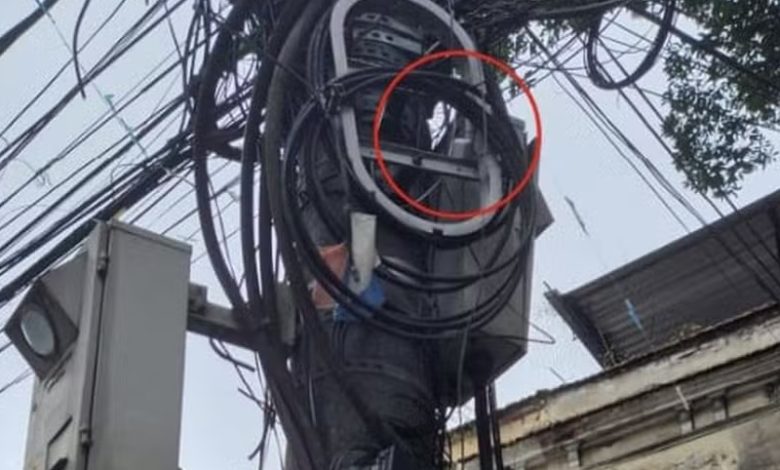 Da campainha, partia um fio que subia por um poste, de onde seguia preso pela fiação até uma segunda edificação do mesmo tipo, instalada na esquina onde estava o casarão abandonado (usado como boca de fumo).