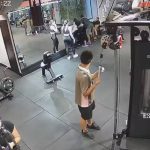 A câmera de segurança da academia registrou o momento do acidente — as imagens são fortes. É possível ver, ao fundo, quando a barra levantada pela jovem caiu.