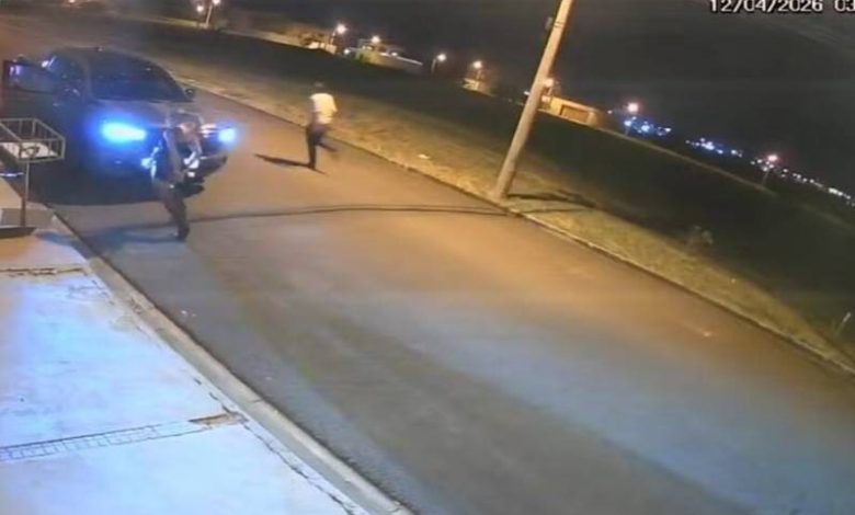 Câmeras de segurança de um imóvel localizado na Rua Acácio de Lima, no bairro Jardim Santa Lúcia, registraram o momento em que o casal chega ao local. O homem estacionou a caminhonete em frente ao prédio e, em seguida, os dois descem do veículo. A mulher aparece com uma cinta em uma das mãos e passa a bater diversas vezes contra o portão.