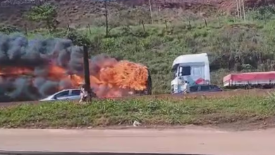 Ônibus de turismo pega fogo em movimento e interdita Rodovia Fernão Dias; em BH