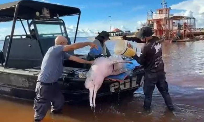 m boto-cor-de-rosa morreu após ser resgatado ferido por policiais e receber os primeiros atendimentos em Coari, no interior do Amazonas. O animal foi encontrado boiando às margens de um rio, ainda com vida.