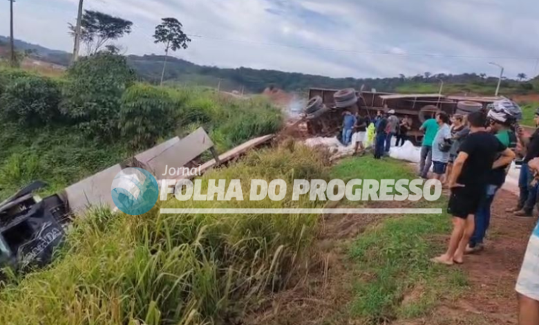 Caminhão carregado de adubo tomba após colidir com duas carretas na BR-163, em Novo Progresso
