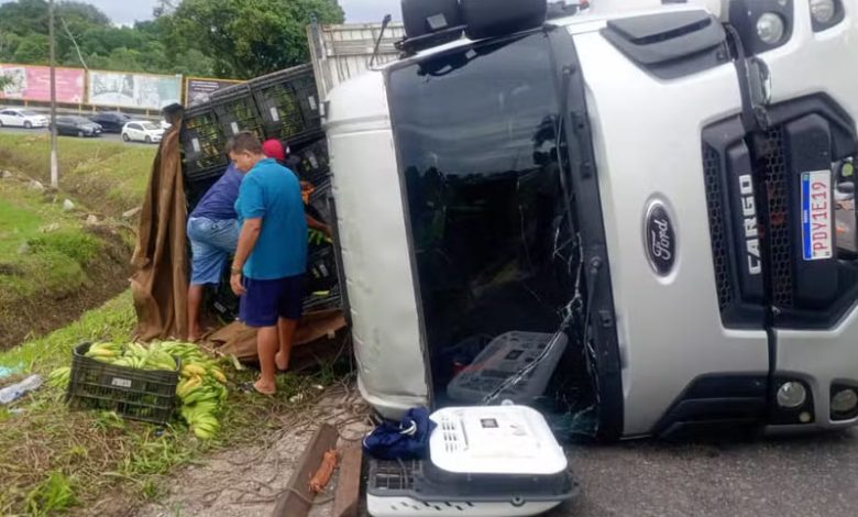Caminhão com 17 toneladas de bananas tomba em viaduto da avenida Mário Covas, na Grande Belém