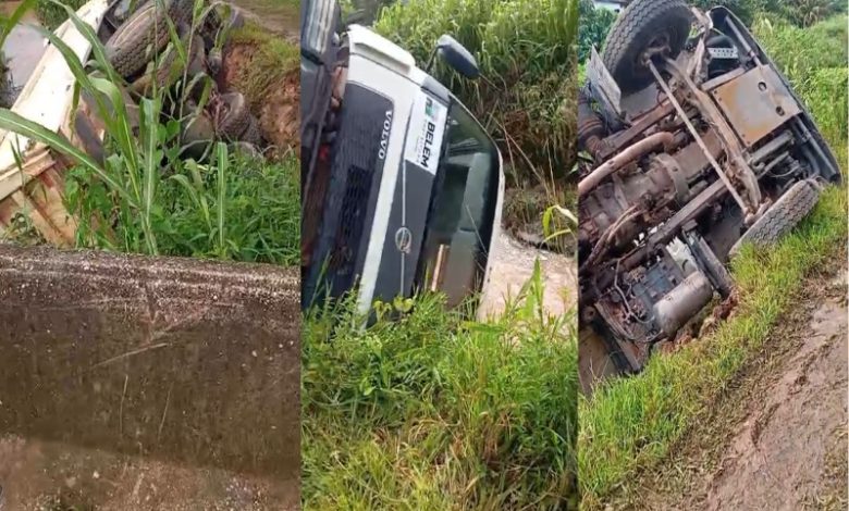 Vídeos que circulam nas redes sociais desde a manhã desta quinta-feira (26) mostram um caminhão da Prefeitura de Belém tombado dentro de um canal na Passagem Espírito Santo, no bairro Paracuri, distrito de Icoaraci, em Belém.