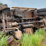 De acordo com informações repassadas pelo motorista, o acidente ocorreu após ele tentar desviar de um veículo que trafegava no sentido contrário. Durante a manobra, o condutor perdeu o controle da direção, fazendo com que o caminhão tombasse fora da pista.