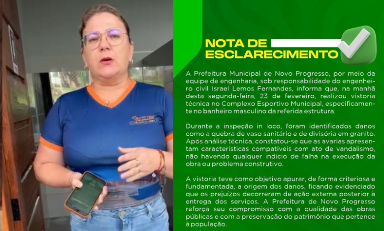 De acordo com a Prefeitura de Novo Progresso, a vistoria foi realizada na manhã de segunda-feira, 23 de fevereiro de 2026, por meio da equipe de engenharia, sob responsabilidade do engenheiro civil Israel Lemos Fernandes. Conforme a nota, após análise técnica no banheiro masculino do Complexo Esportivo Municipal, “as avarias apresentam características compatíveis com ato de vandalismo, não havendo qualquer indício de falha na execução da obra ou problema construtivo”.