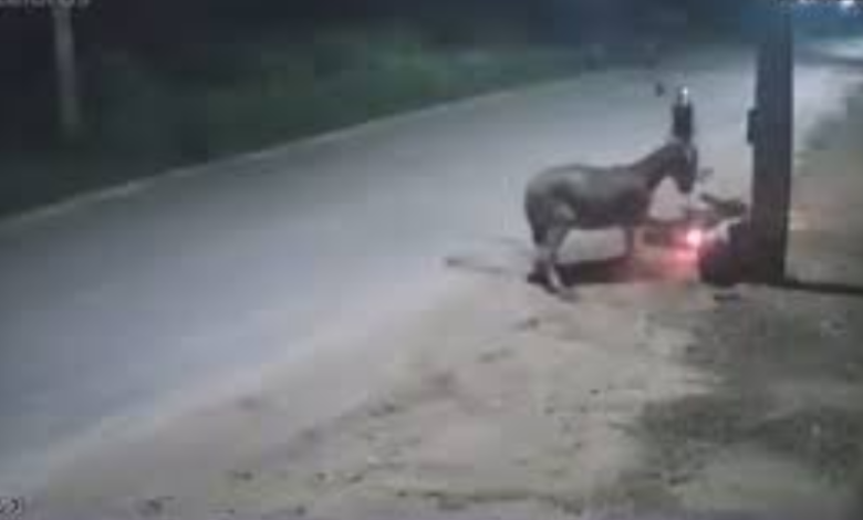 O caso foi registrado por uma câmera de segurança, que mostra o cavalo atravessando a via e correndo em direção ao motociclista (veja o vídeo acima). O animal acabou derrubando o homem da motocicleta antes de fugir do local.