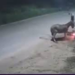 O caso foi registrado por uma câmera de segurança, que mostra o cavalo atravessando a via e correndo em direção ao motociclista (veja o vídeo acima). O animal acabou derrubando o homem da motocicleta antes de fugir do local.