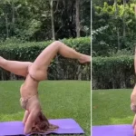 Nas imagens, Leticia surge usando um pequeno biquíni de oncinha enquanto executa uma inversão apoiada, ficando completamente de cabeça para baixo. A postura, conhecida na ioga como Salamba Sirsasana, exige equilíbrio, força do core (região abdominal) e alta concentração.