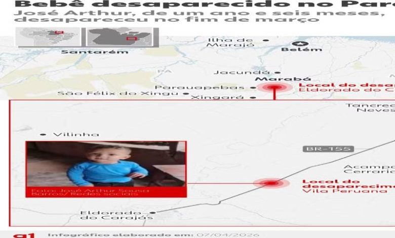 As investigações sobre o desaparecimento do bebê José Arthur recebem reforços a partir desta quarta-feira (8). Uma equipe da Delegacia de Pessoas Desaparecidas, de Belém, viajou 652 quilômetros até Eldorado do Carajás, no sudeste do estado, para auxiliar nas buscas.