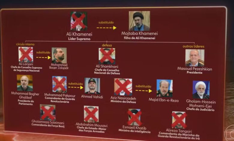 O filho de Khamenei, Mojtaba, virou o novo líder do país. O chefe do Conselho de Segurança Nacional, Ali Larijani, foi morto pouco depois, assim como o ministro da Inteligência. Os dois também já foram substituídos. O comandante da Marinha da Guarda Revolucionária e o responsável pela unidade de repressão aos protestos internos também foram mortos, mas as forças continuaram atuando.