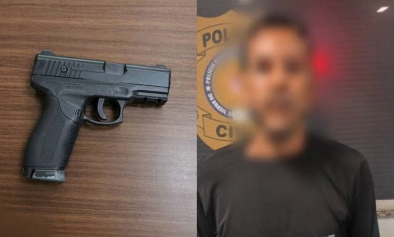 Já no período da tarde, ao retornarem à área indicada, os militares encontraram um homem com as mesmas características informadas. Ele foi abordado e, durante a revista no veículo, foi localizado um simulacro de arma de fogo, modelo pistola de pressão CO₂, da marca KWC.