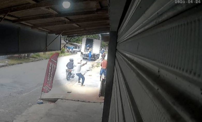 Imagens de câmera de segurança mostram o momento em que o suspeito desce da moto e tenta atirar à queima-roupa, mas a arma falha. Nesse instante, a vítima corre para dentro da residência e consegue se proteger antes de novos disparos.