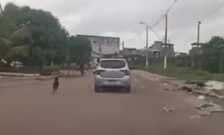 Em seguida, o carro arranca e vai embora, com o animal correndo atrás. Minutos depois, o cachorro é visto andando sozinho pela via.