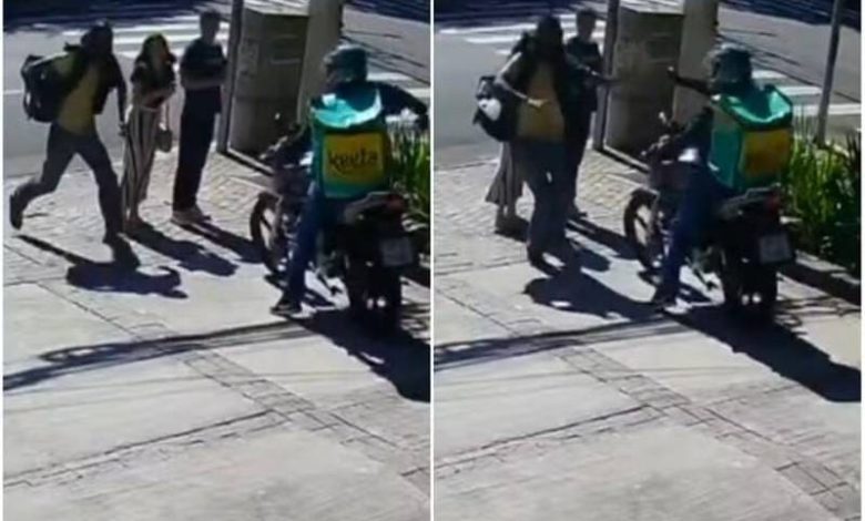 Imagens de câmera de segurança mostram quando um falso entregador em motocicleta aponta uma arma para um casal que passava pela calçada. Poucos segundos depois, um homem que vinha andando pela calçada tenta intervir e é baleado. Ele fica caído na calçada enquanto o criminoso foge.
