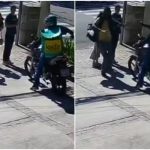 Imagens de câmera de segurança mostram quando um falso entregador em motocicleta aponta uma arma para um casal que passava pela calçada. Poucos segundos depois, um homem que vinha andando pela calçada tenta intervir e é baleado. Ele fica caído na calçada enquanto o criminoso foge.