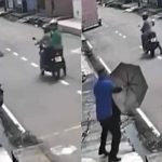 Diante da situação, a vítima reagiu de maneira inesperada: posicionou o guarda-chuva à sua frente, escondendo-se parcialmente atrás do objeto. A atitude, aparentemente simples, acabou surpreendendo os criminosos.