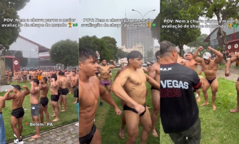 Em vídeo divulgado nas redes sociais, os participantes aparecem sem camisa durante a avaliação física, enquanto uma forte chuva cai sobre o espaço turístico da capital paraense. “Nem a chuva parou a maior avaliação de shape do mundo”, escreveu a organização na publicação.