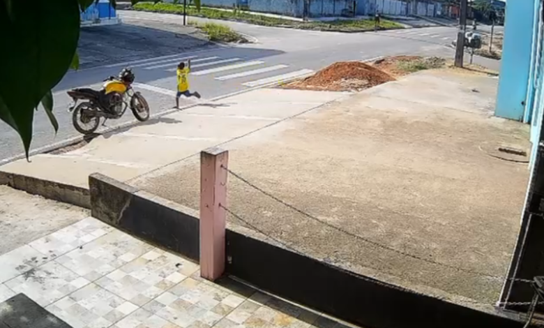 Imagens de câmeras de segurança registraram o momento em que uma criança foi atropelada na tarde deste domingo (15), na Rua Altamira, bairro Cristo Rei, em Novo Progresso.
