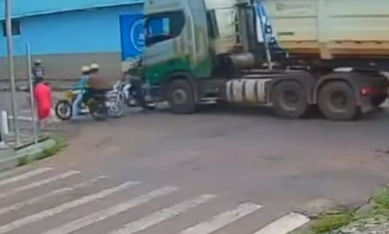 Imagens de câmeras mostram o momento em que uma carreta reduz a velocidade no centro da via enquanto outros veículos seguem passando pelos dois lados. Em seguida, a carreta avança, justamente quando uma motocicleta, ocupada por um casal, passa à frente do veículo. O motorista da carreta não percebe a presença da moto e acaba colidindo.