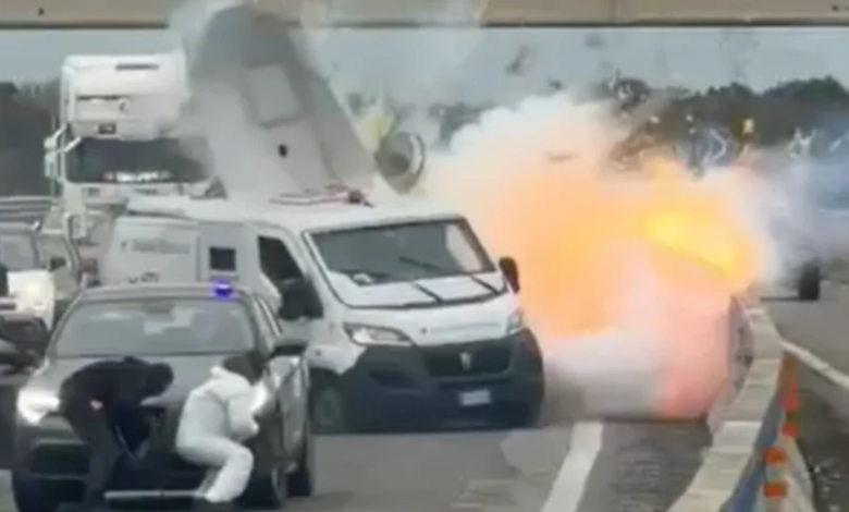 Uma gangue de homens fortemente armados atacou dois carros-fortes em um assalto no sul da Itália nesta segunda-feira (9/2), na Rodovia 613, que liga as cidades de Brindisi e Lecce. Dois suspeitos foram presos após uma perseguição. Um vídeo gravado por uma testemunha registra o momento em que um dos veículos é explodido, enquanto um dos assaltantes segura um fuzil. Veja: