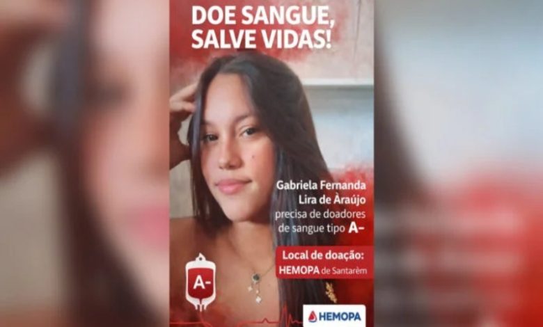 Gabriela Fernanda Lira de Araújo, de 24 anos, está hospitalizada; População é convocada a doar sangue tipo A- na HEMOPA de Santarém para ajudar no tratamento.