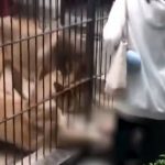 Imagens que circulam nas redes sociais mostram o momento em que o felino agarra a perna da criança e tenta puxá-la para dentro da jaula, causando gritos de desespero de pessoas que estavam no local.