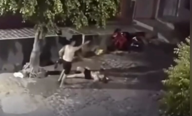 De acordo com o relato, o suspeito desferiu socos e chutes. Câmeras de segurança registraram o momento em que a vítima cai no chão e continua sendo agredida