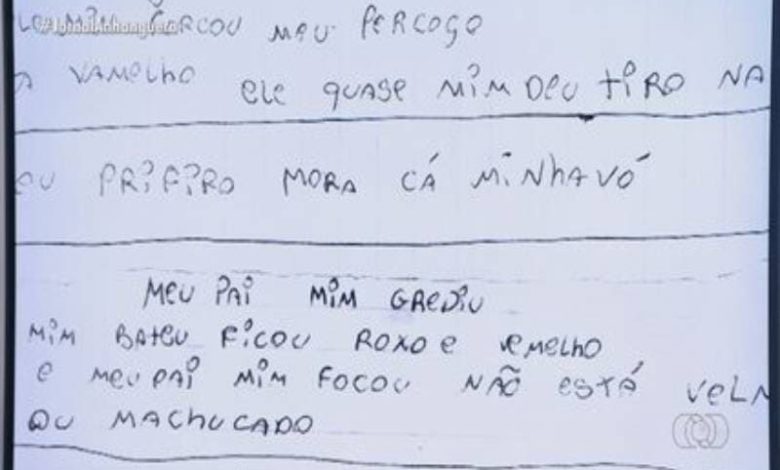 Ao longo da folha, ela repete as agressões que teriam sido cometidas pelo pai, além de dizer que ele quase a matou. A adolescente termina o bilhete pedindo socorro e diz que prefere morar com a avó.