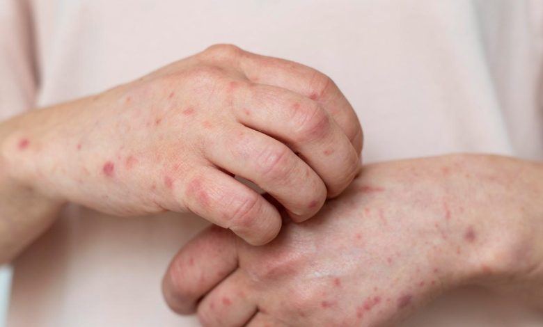 O paciente com sarampo apresenta erupções avermelhadas na pele e coceira intensa nas mãos. A transmissão do vírus é de pessoa a pessoa, por via aérea, ao tossir, espirrar, falar ou respirar.