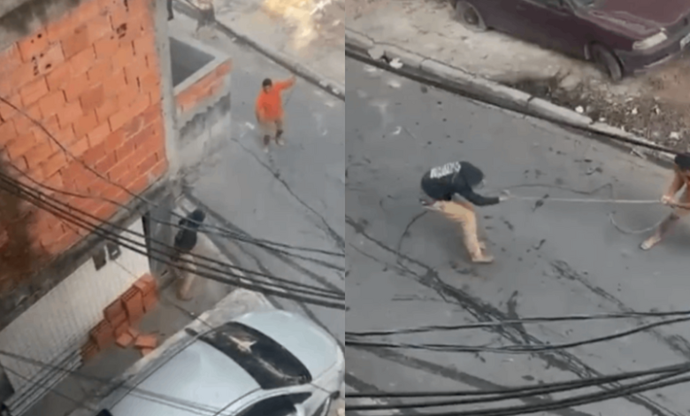 As imagens mostram que, logo em seguida, o homem foi surpreendido por um morador que utilizou uma corda para imobilizá-lo. Antes de ser contido, o suspeito ainda chegou a pegar um tijolo. O laço atingiu os braços e o tronco do indivíduo, que caiu no chão e foi amarrado até a chegada de ajuda. Pessoas que acompanhavam a cena reagiram verbalmente durante a ação.