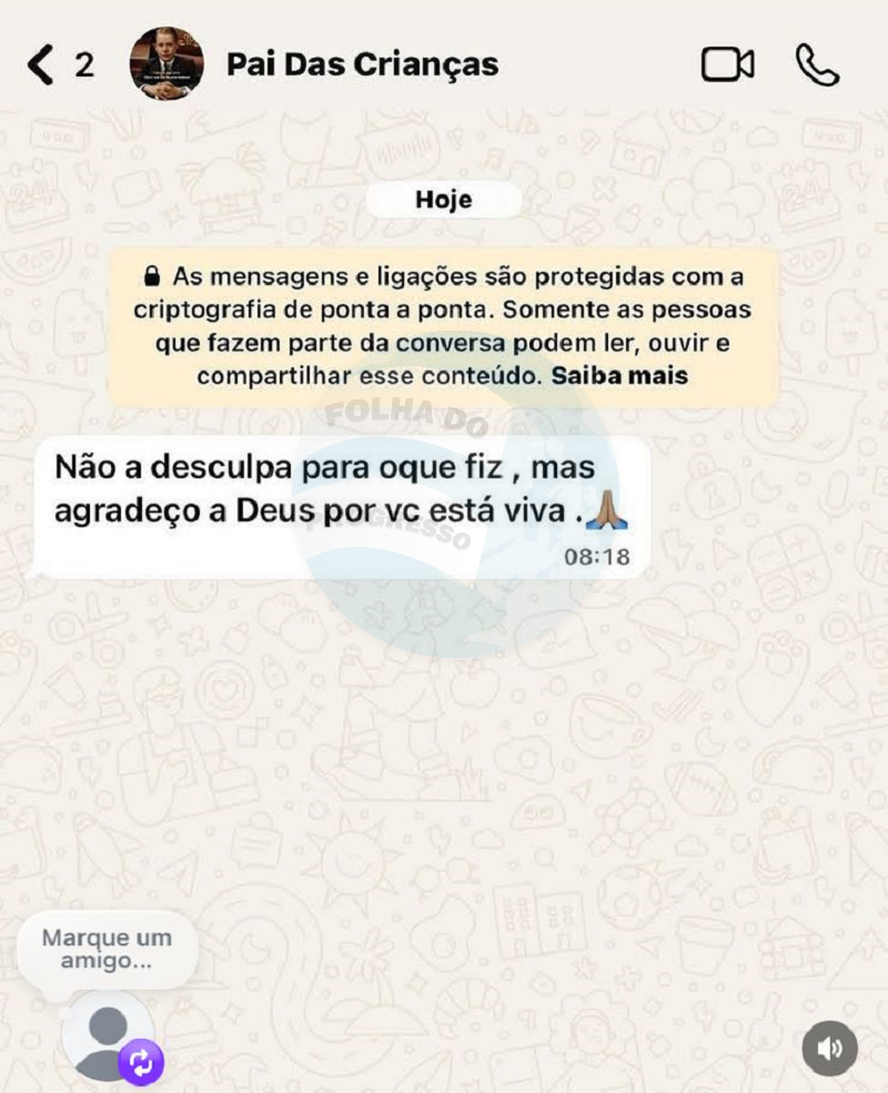 Por volta das 08h18, já após o crime, o suspeito teria enviado uma mensagem à vítima com o seguinte conteúdo: “Não há desculpa para o que fiz, mas agradeço a Deus por você estar viva.”