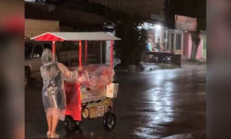 Nas imagens, a empreendedora aparece empurrando seu carrinho de alimentos pelas ruas, vestindo capa de chuva, enquanto o equipamento também está protegido para evitar que os produtos se molhem. Mesmo sob chuva, ela segue atendendo clientes, parando nos pontos onde é chamada.