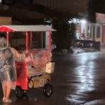 Nas imagens, a empreendedora aparece empurrando seu carrinho de alimentos pelas ruas, vestindo capa de chuva, enquanto o equipamento também está protegido para evitar que os produtos se molhem. Mesmo sob chuva, ela segue atendendo clientes, parando nos pontos onde é chamada.