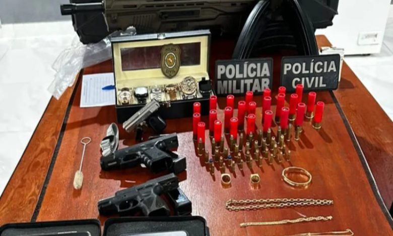 Na residência das quatro pessoas presas em flagrante foram apreendidos cerca de quatro quilos de cocaína, uma espingarda, quatro pistolas, munições diversas, cerca de 20 celulares, cordões e anéis em ouro e relógios de luxo.