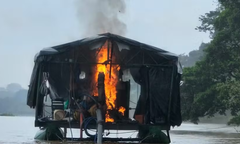 Agentes da PF e Funai desmantelaram duas dragas, um acampamento e uma escavadeira em atividade garimpeira ilegal no Rio Fresco, na Terra Indígena Kayapó.