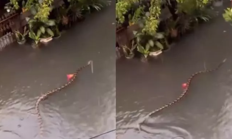 Após três dias de chuvas intensas, moradores registram cobras de até 5 metros nadando em áreas inundadas na Indonésia.