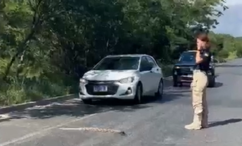 A equipe da PRF estava encerrando o turno de serviço quando percebeu a presença do animal na pista. Diante do risco de atropelamento, os agentes decidiram sinalizar a via e paralisar o trânsito por alguns minutos até que a serpente alcançasse o outro lado da rodovia.