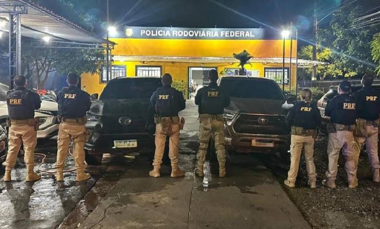 Por volta das 18h20, os agentes abordaram duas caminhonetes, uma Hilux e uma SW4, cada uma ocupada por um condutor. Após consulta ao sistema, foi constatado que ambas tinham registro de roubo ou furto na cidade de João Pessoa/PB, ocorrido no mês de abril deste ano.