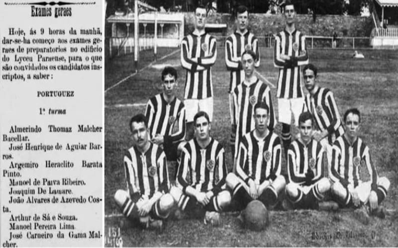 Joaquim de Lamare e José Carneiro da Gama Malcher listados como colegas de escola. À direita, Botafogo “juventino” campeão de 1910 com cinco paraenses (dois De Lamare e três Sodré), todos descendentes de ex-governadores do Pará