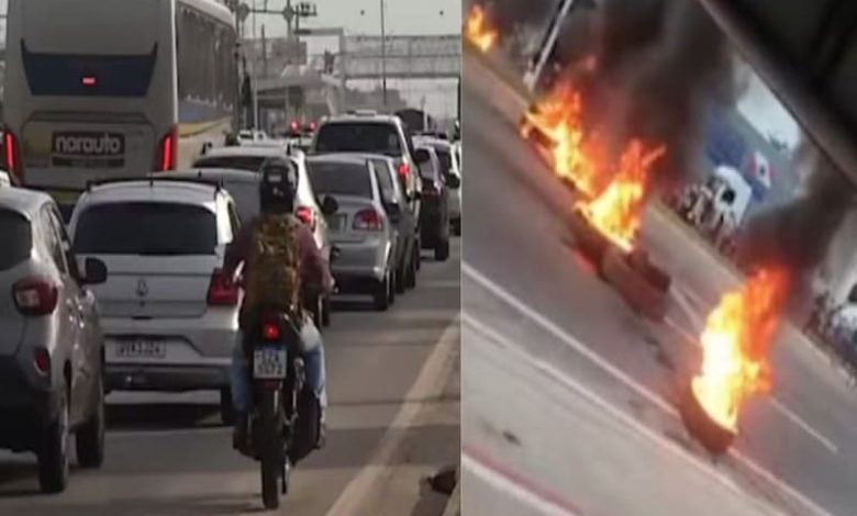 Além do fogo, pneus também foram usados pelos manifestantes. Eles seriam contra a retirada de famílias de uma comunidade na região após uma reintegração de posse.