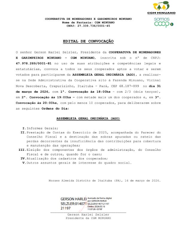 Publicação Nº 038/2026 – EDITAL DE CONVOCAÇÃO COOPERATIVA DE MINERADORES E GARIMPEIROS MINUANO