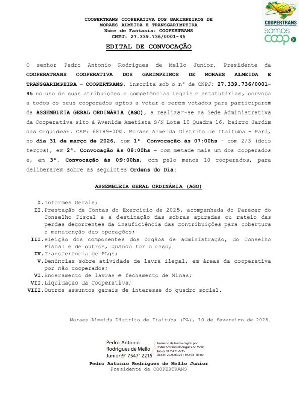 Publicação Nº 047/2026 – COOPERTRANS COOPERATIVA DOS GARIMPEIROS DE MORAES ALMEIDA E TRANSGARIMPEIRA