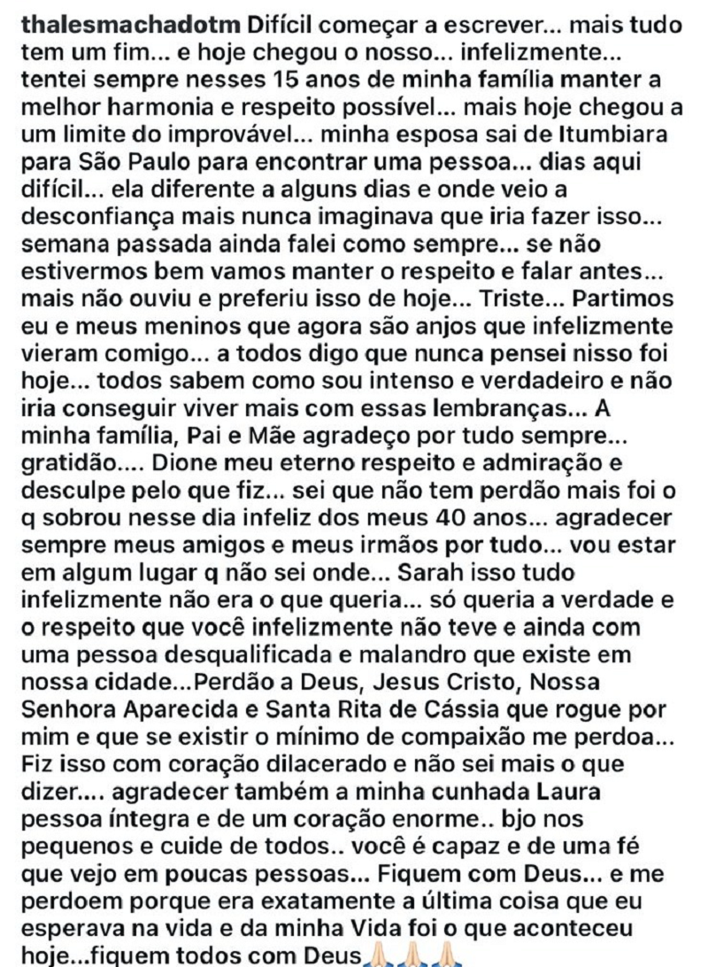 Ainda segundo a imprensa, ele também teria publicado uma mensagem de despedida, na qual pedia desculpas e sugeria que a motivação estaria relacionada a uma suposta traição da esposa, mãe das crianças. A postagem foi posteriormente apagada.