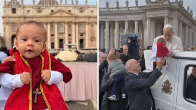 Vestido de papa, bebê brasileiro recebe bênção de Leão XIV no Vaticano