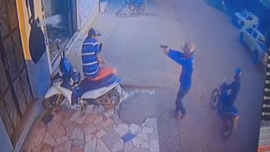 Câmeras de vigilância do local registraram o momento em que os criminosos chegam em uma motocicleta e o garupa efetua…